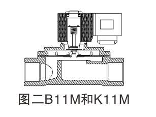 该阀代号M系列,依据膜片运动封腔泄压设计,阀分为常闭型和常开型两种。原理:常闭型(常态,呈关闭状态),当线圈通电时,产生电磁力使动铁芯和静铁芯吸合,随着动铁芯上移,直拉开启膜片上小阀口,在卸流卸压的同时,经过中间弹簧复拉提升密封膜片,使膜片向上运动从而开启主阀,介质通过。当线圈断电时,电磁力消失,此时动铁芯在复位弹簧和介质压力的同时作用下,依次关闭主阀,介质断。复拉膜片结构,可实现零压差启动。常开型工作原理正好相反。如图二: B11M和K11M电磁阀。