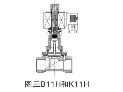 该阀代号H系列,依据活塞运动封腔泄压设计,阀分为常闭型和常开型两种。原理:常闭型(常态呈关闭状态),当线圈通电时,产生电磁力使动铁芯和静铁芯吸合,随着动铁芯上移,直拉开启活塞上小阀口,在卸流卸压的同时,经过中间弹簧复拉提升密封活塞,使活塞阀芯向上运动从而开启主阀,介质通过。当线圈断电时,电磁力消失,此时动铁芯在复位弹簧和介质压力的同时作用下,依次关闭,断电时,电磁力消失,此时动铁芯在复位弹簧和介质压力的同时作用下关闭主阀,介质断。复拉活塞结构,可实现零压差启动。常开型工作原理正好相反。如图三: B11H和K11H电磁阀。