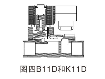 该阀代号D系列,依据先导泄压膜片封腔设计,阀分为常闭型和常开型两种。原理:常闭型(常态,呈关闭状态),当线圈通电时,产生电磁力使动铁芯和静铁芯吸合,随着动铁芯上移,先导腔开启泄压带动主阀膜片.上腔泄压,使膜片向上运动从而开启主阀,介质通过。当线圈断电时,电磁力消失,此时动铁芯在复位弹簧和介质压力的同时作用下,关闭小导阀,此时介质从平衡孔流入,主阀膜片上腔压力增大,并在弹簧力的作用下,关闭主阀口。常开式原理正好相反。如图四: B11D和K11D系列电磁阀。