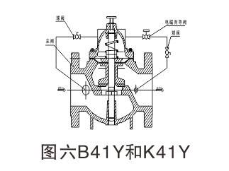 该阀代号Y系列,依据先导多路旁通泄压设计,原理:由主阀和多个旁通外导阀连接组成。如常闭型(常态呈关闭状态)。当线圈通电时,外阀先导旁通泄压把主阀上腔压力迅速变小,使主阀阀芯向.上移动,开启主阀,介质通过。当线圈断电时,电磁力消失,此时介质从平衡孔流入,主阀上腔压力增大,并在弹簧力加介质压力的作用下关闭主阀口。常开阀原理结构主阀上腔正好相反。如图六: B41Y和K41Y的电磁阀